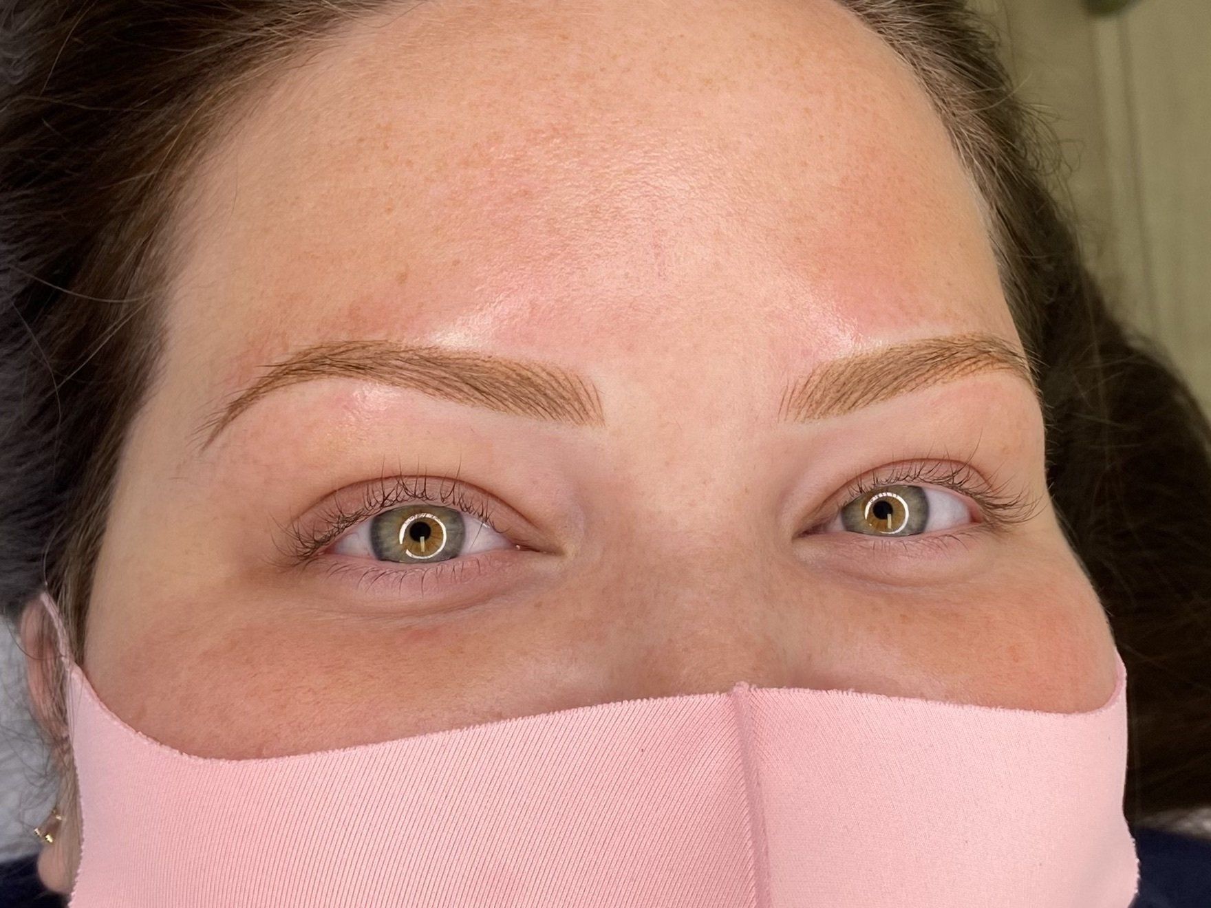 Microbladed hair strokes in the front of the brow with powder shading in the body and tail.
